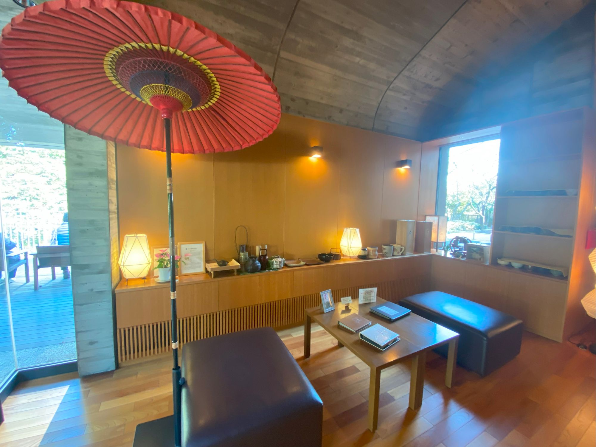 The indoor rest area gives off a cosy Japanese vibe. On the table you' will find albums of plant and flower specimens.